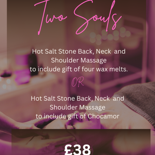 Hot Salt Stone back, neck and shoulder massage, to include a gift of four wax melts or chocamor chocolate.